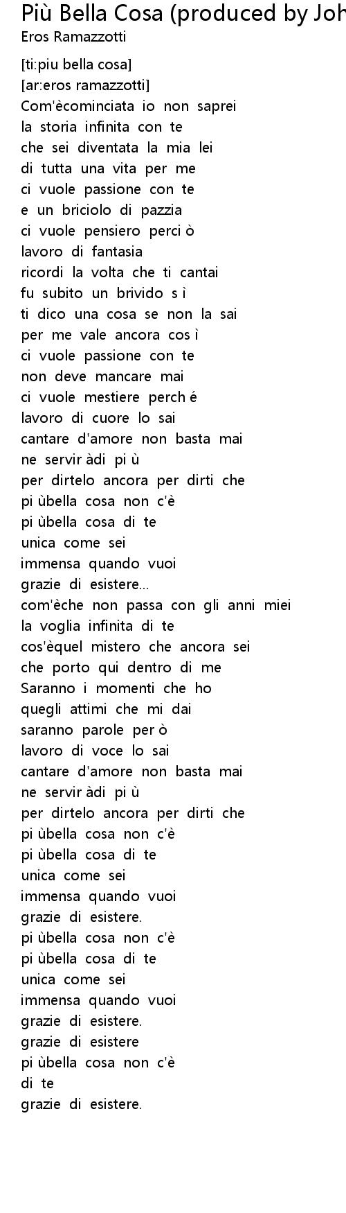 Com′è cominciata io non saprei la storia infinita con te che sei . Deutsche übersetzung des songtexts für più bella cosa by eros ramazzotti. Übersetzung des liedes „più bella cosa“ (eros ramazzotti) von italienisch nach deutsch. Die deutsche übersetzung von più bella cosa und andere eros ramazzotti lyrics und videos findest du kostenlos auf songtexte.com.