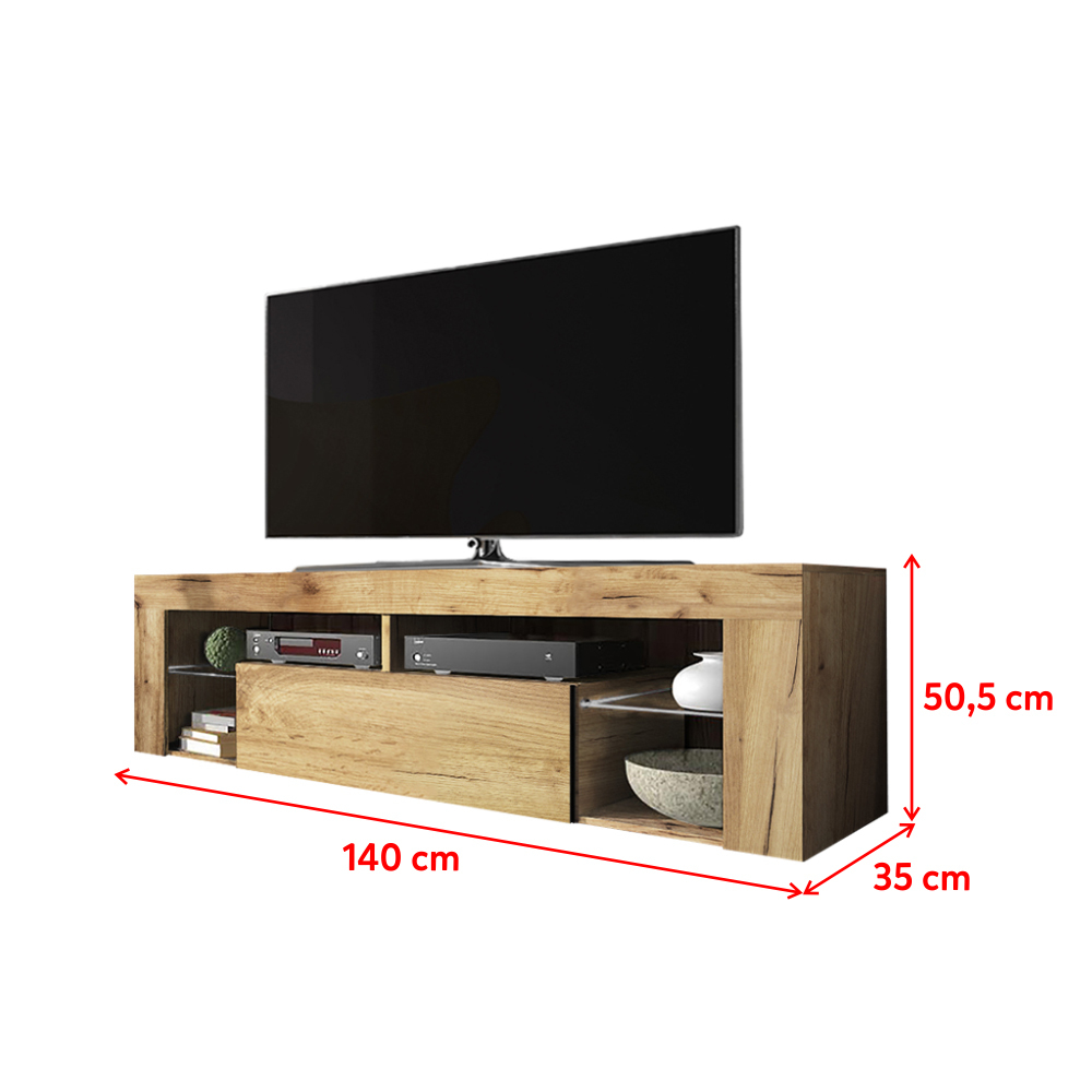 Meuble Tv / Banc Tv – Bianko – 140 Cm – Chêne Lancaster – Sans Led – Style Moderne – Tablettes En Verre dedans Meuble Tv Hauteur 80 Cm