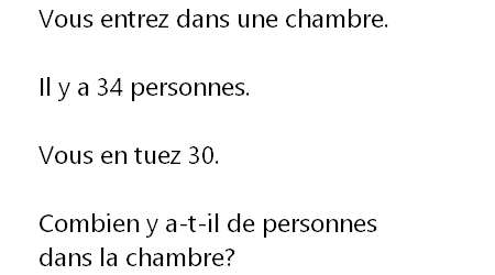 “vous entrez dans une chambre où il y a, sur le lit, 2 chiens, 4 chats, une girafe, 5 vaches et un canard, et 3 poulets volent. Tu entres dans une chambre et tu vois sur le lit 2 chiens, 4 chats, 1 girafe et 5 vaches. Il y a aussi 3 poules qui volent . Vous entrez dans une chambre où il y a, sur le lit, deux chiens, quatre chats, une girafe, cinq vaches et un canard . Vous entrez dans une chambre et voyez sur le lit 2 chiens, 4 chats, 1 girafe et 5 vaches.
